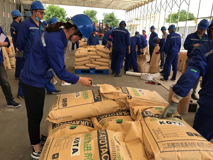 生產(chǎn)組的比賽設(shè)在了倉庫門口,比賽過程緊張而激烈,稱重、縫包、打托、纏膜,班組成員熟練而有序地完成這一系列的操作,無需多言,拼的就是平時工作的默契。
